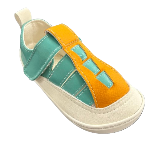 Diseño color agua marina y naranja con suela blanca.