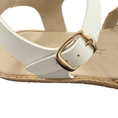 La parte delantera está confeccionada en yute trenzado, un material transpirable que aporta un estilo veraniego y natural. En la zona trasera, incorporan una tira con hebilla ajustable al tobillo, que permite adaptar la sandalia al pie para una sujeción segura y personalizada.