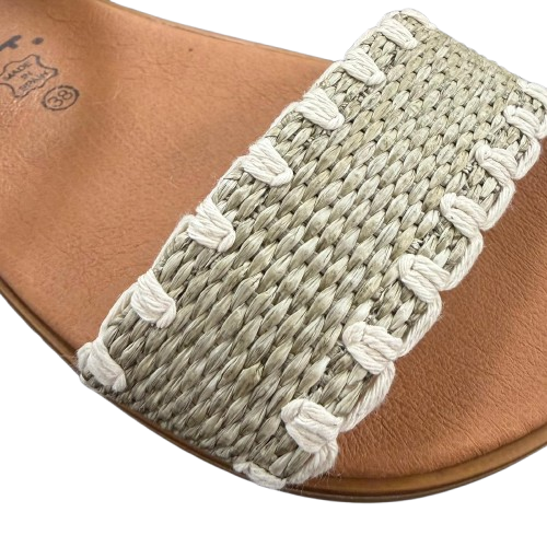 La parte delantera está elaborada en yute, un material transpirable y sostenible que aporta frescura y un estilo único. La zona del tobillo incorpora cuero de alta calidad con hebilla ajustable, permitiendo una sujeción firme y personalizada.